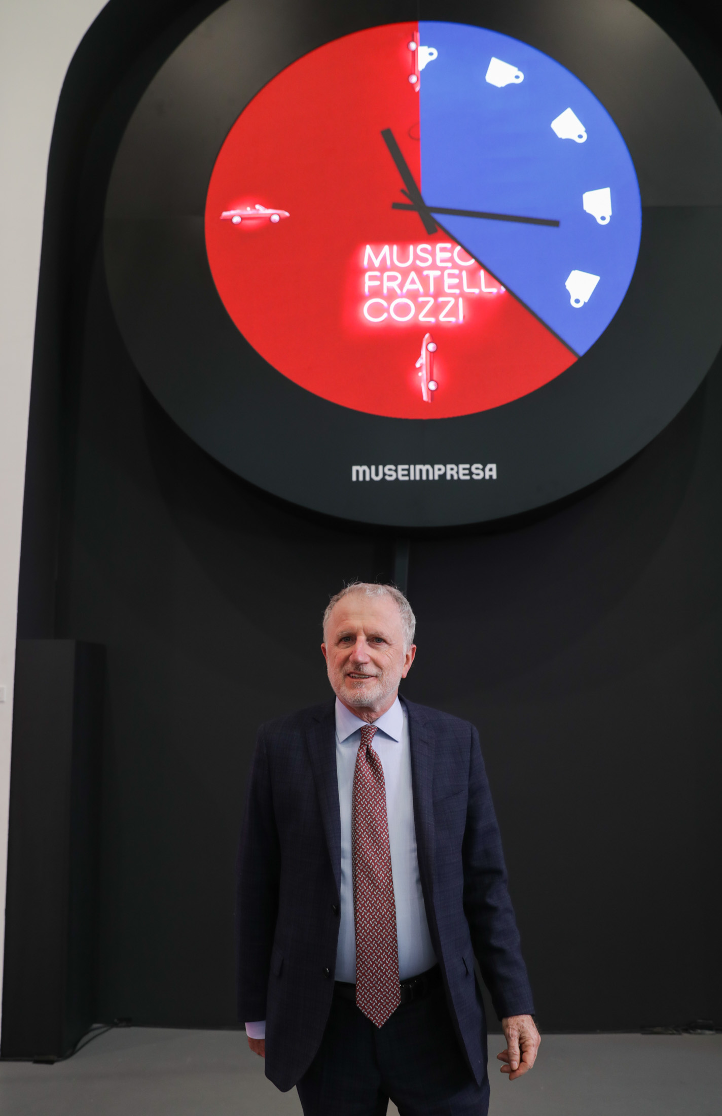 Ogni museo è rappresentato da un’immagine identitaria che si alterna, ogni minuto, a quelle degli altri musei e archivi sul quadrante di un grande orologio, metafora della stratificazione nel tempo della cultura di impresa. Il movimento della lancetta dei secondi compone ogni volta un quadrante diverso. Il pendolo, con la sua scansione ritmica, è la rappresentazione simbolica di passato, presente, futuro, e racconta della capacità delle aziende di guardare alla propria storia, di operare nell’oggi e di volgere lo sguardo al futuro in un processo di continua innovazione.